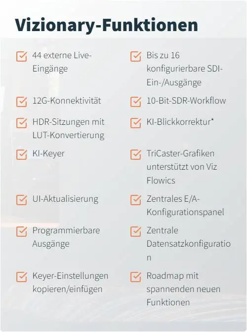 TriCaster Vizion bietet die neueste IP-Konnektivität, konfigurierbare SDI-E/A, leistungsstarkes Switching, Audio-Mixing, neue KI-Funktionen und modernste Grafik.